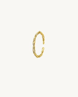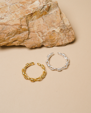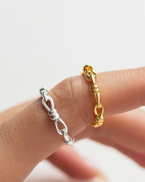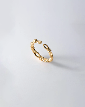 An elegant open-band ring crafted with interwoven links that form subtle knots — symbolising strength, unity, and connection. Designed for effortless wear, the Knotted Link Ring comes in gold and silver tones, perfect for stacking or wearing solo.