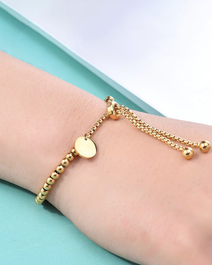 The adjustable chain ensures a perfect fit for all wrist sizes, while the polished round beads and minimalist charm add a touch of sophistication.